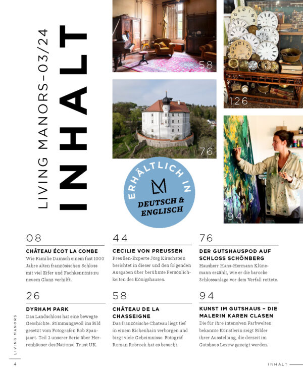 In dieser Ausgabe: Château Écot La Combe, Dyrham Park, Cecilie von Preussen, Château de la Chasseigne, Der Gutshauspod zu Gast auf Schloss Schönberg, Malerin Karen Clasen, Gutshaus Goldenbow, Tagebuch einer Vintage-Jägerin