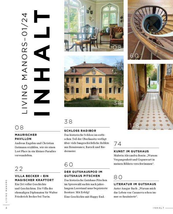 In dieser Ausgabe: Maurischer Pavillon, Lost Place Villa Becker, Schloss Radibor, Der Gutshauspod im Gutshaus Pitschen, Dwasieden – das weiße Schloss am Meer, Villa St. Niklaus