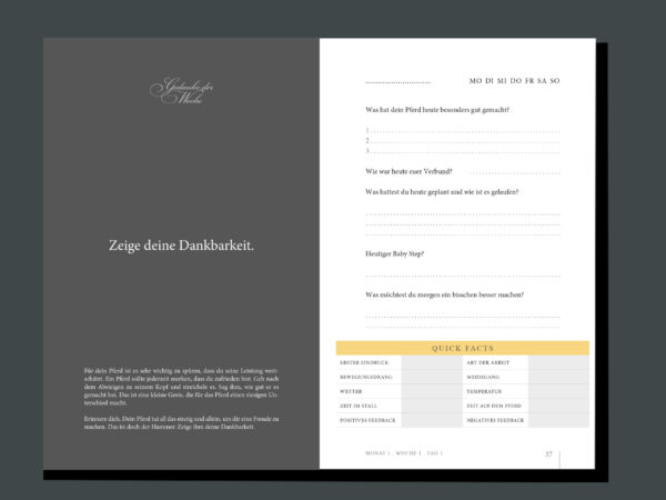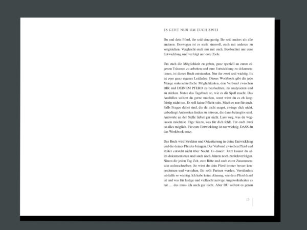 Das neue Workbook zum Bestseller “Sprechen wir mal Pferd” ist ein, auf 6 Monat angelegtes, Intensiv-Coaching, in dem die Autorin ihre Leser und Leserinnen und deren Pferde – quasi als Personal-Trainer – bei deren täglicher Arbeit begleitet und mit Tipps, Tricks und Quick-Facts unterstützt.